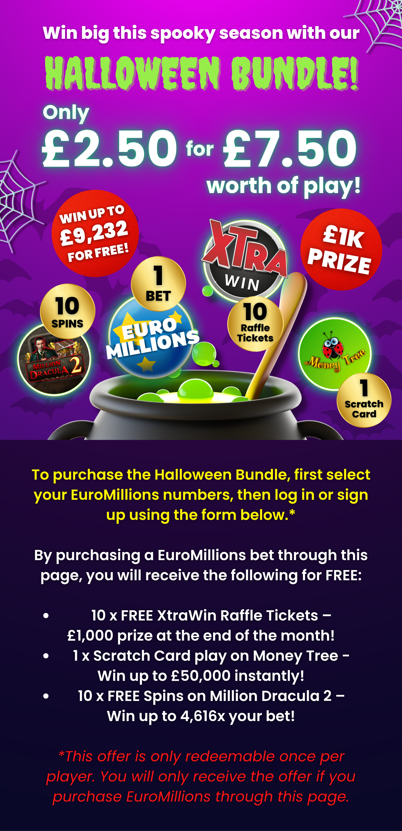 To claim the Halloween Bundle, simply select your EuroMillions numbers above and sign up/log in using the form to make your purchase. Once your entry is complete, your tickets/gameplay will be visible in your account.