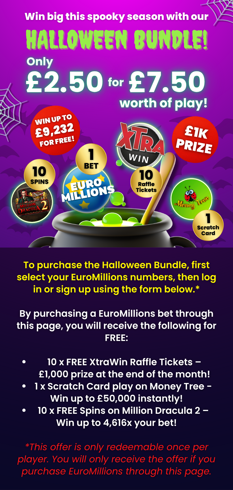 To claim the Halloween Bundle, simply select your EuroMillions numbers above and sign up/log in using the form to make your purchase. Once your entry is complete, your tickets/gameplay will be visible in your account.